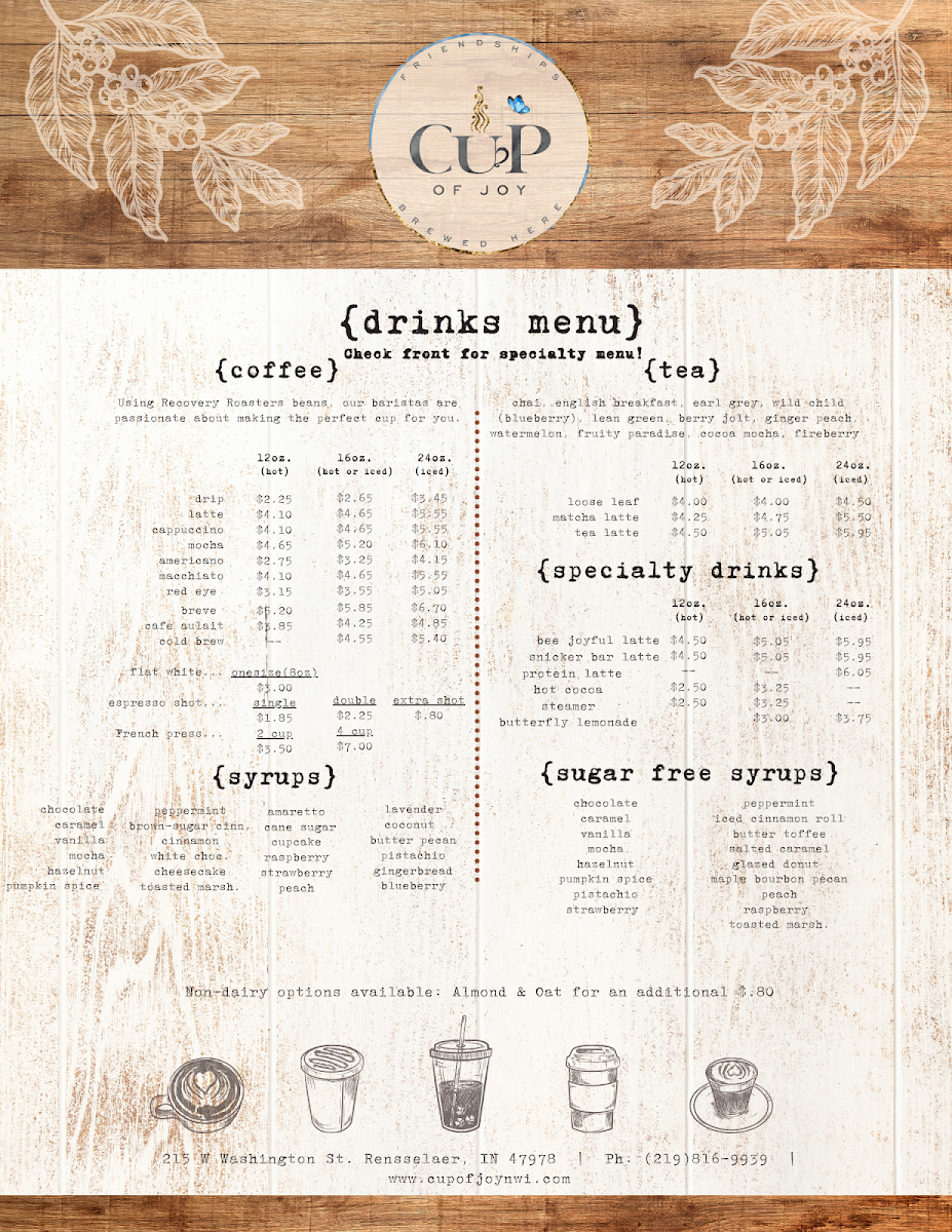 Welcome to Cup of Joy Cafe, Too, an enchanting haven nestled at 215 W Washington St, Rensselaer, IN. This charming coffee shop seamlessly blends exquisite brews with a cozy atmosphere, making it a favorite destination for both locals and travelers.